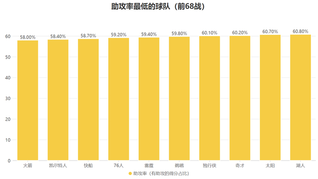 由于这样的进攻模式更多依赖球员的冲击力,当队友出手时有能力的球员都尝试冲抢篮板而不会等待队友分球,因此火箭的配合出手得分占比极低,他们前68战的助攻率也就是球队有助攻的得分占比仅有联盟最低的58%,因此那支火箭的比赛模式特别另类,但很多时候也的确有着不错的效果。