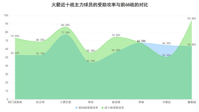 由于杜兰特时常被包夹火箭的转变思路是由队友为他进行掩护后接球,当杜兰特接球后不进行过多持球运球而是短时间内快速处理是出手还是传球,同时队友增多移动接球的机会,因此火箭多名主力的受助攻率对比前68战都出现了上升,这种进攻战术的开发令对手对于杜兰特的包夹策略受到了很大的抑制。